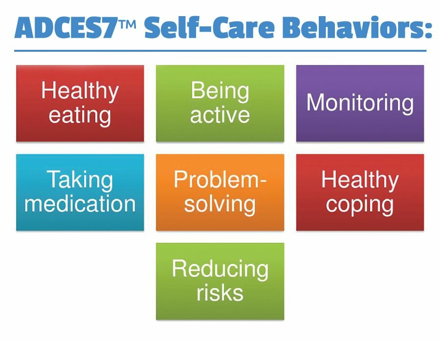 We focus on the ADCES’s (Association of Diabetes Care & Education Specialists) 7 Self-Care Behaviors: