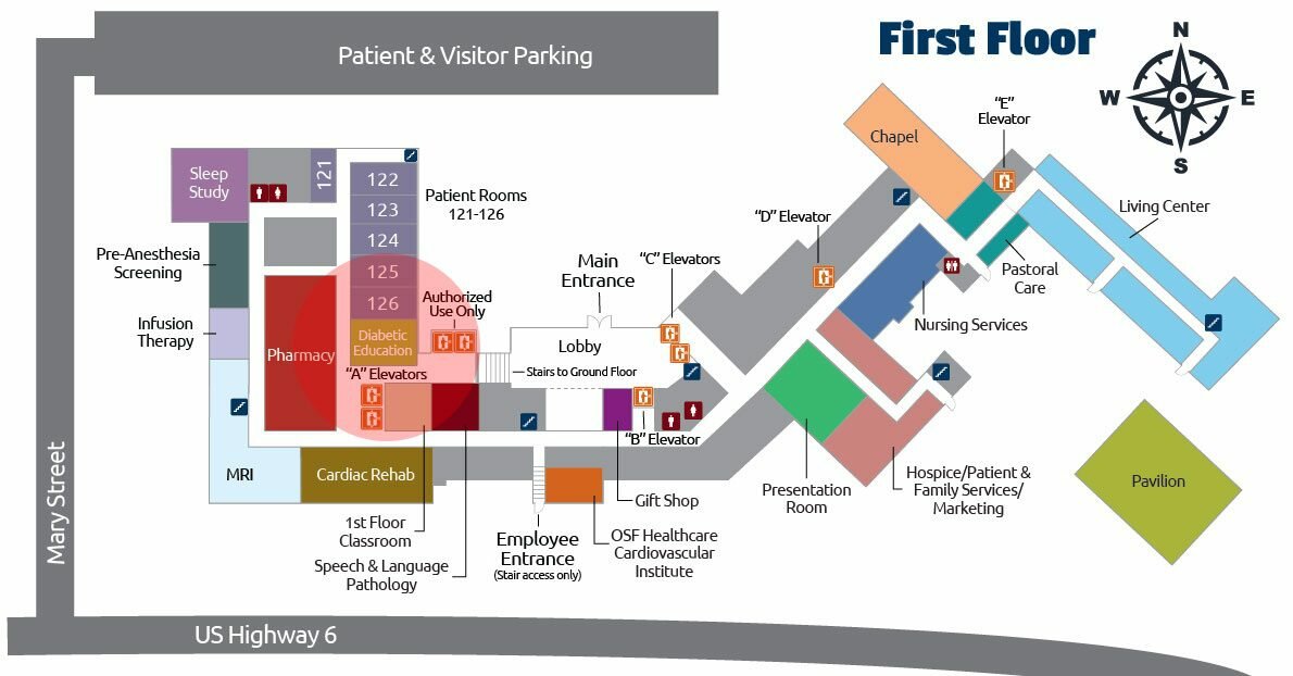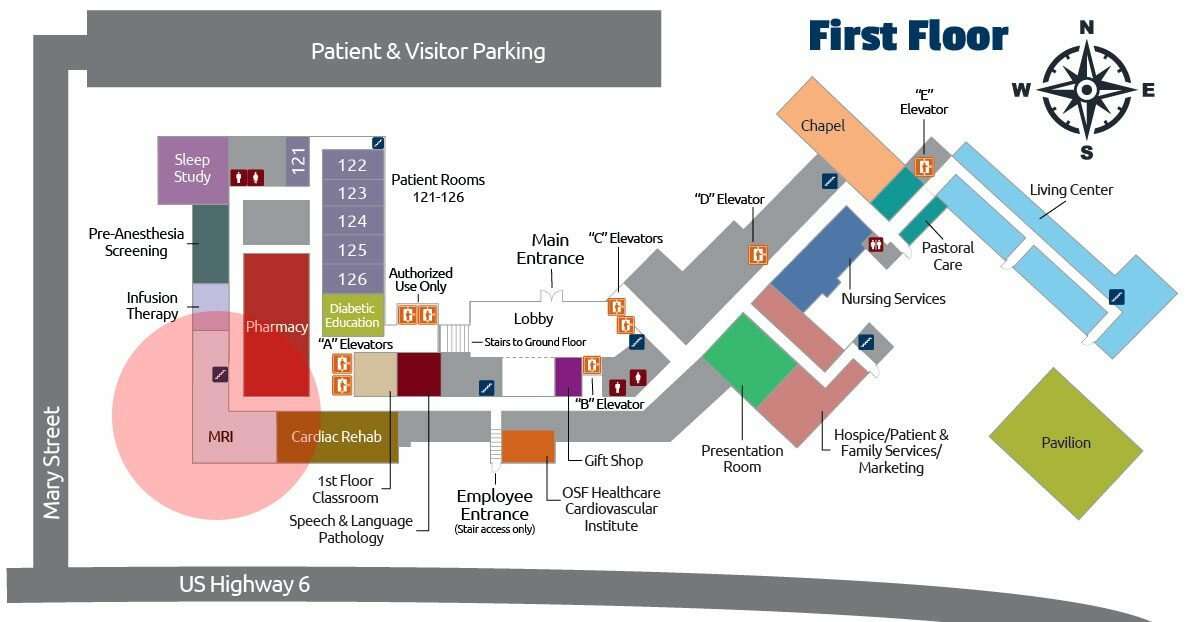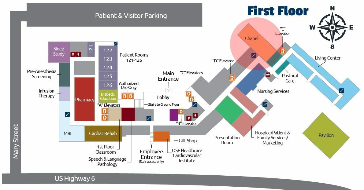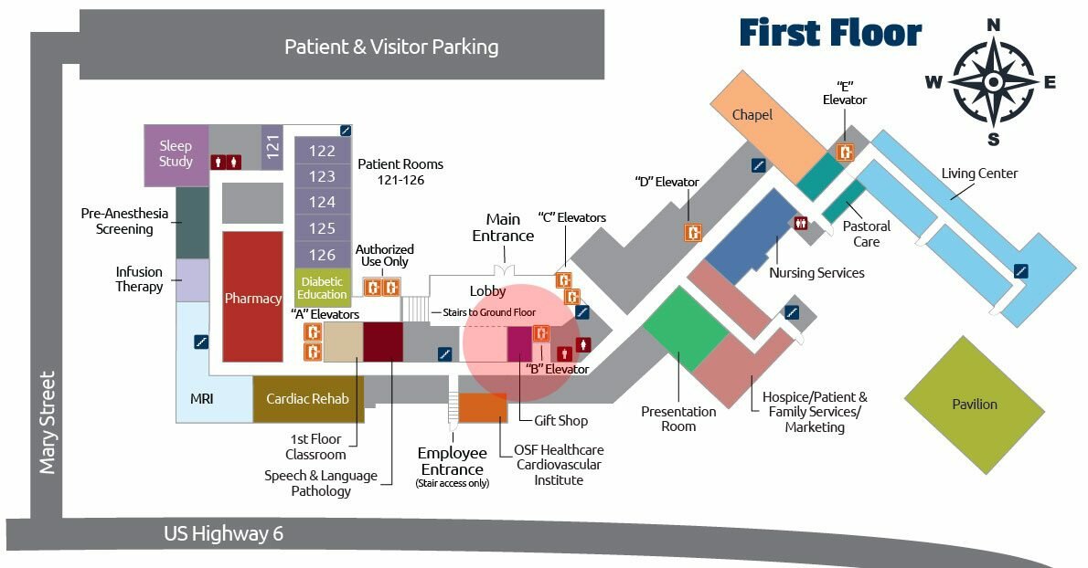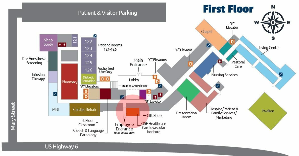 - The OSF Healthcare Cardiovascular Institute is to your left, across from the upper lobby area.