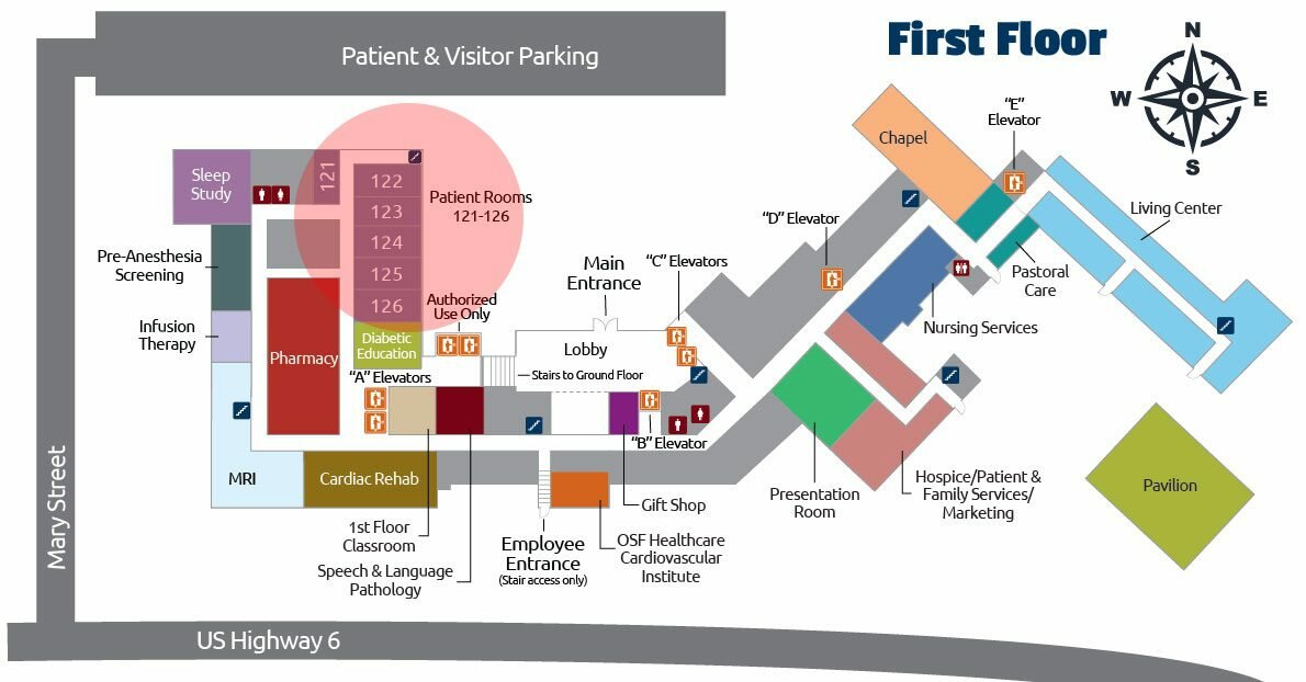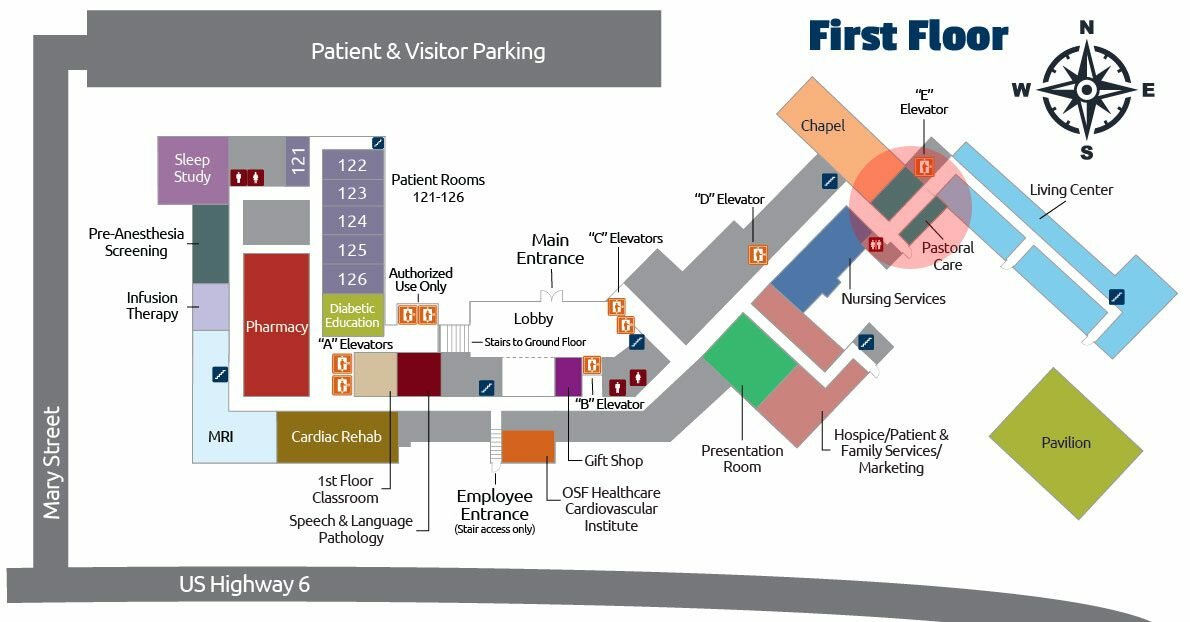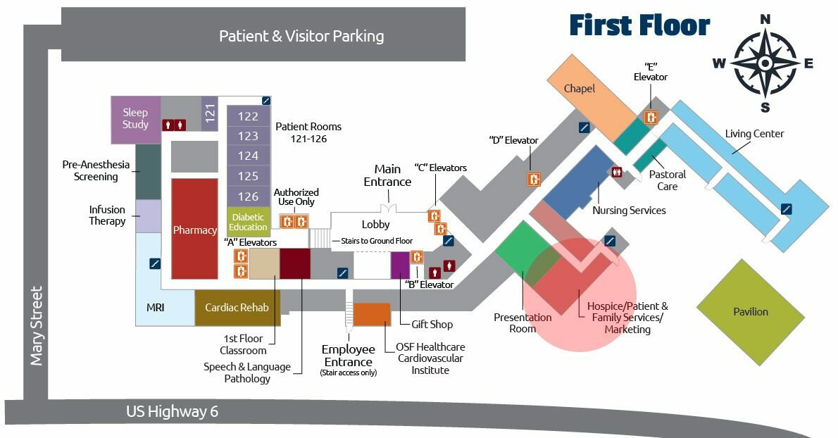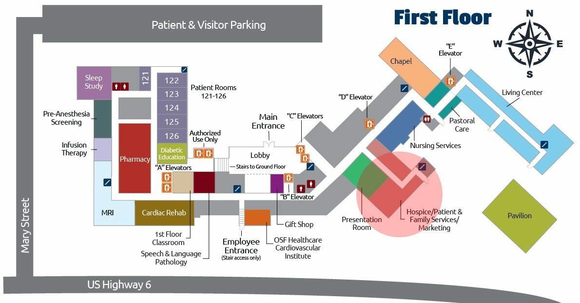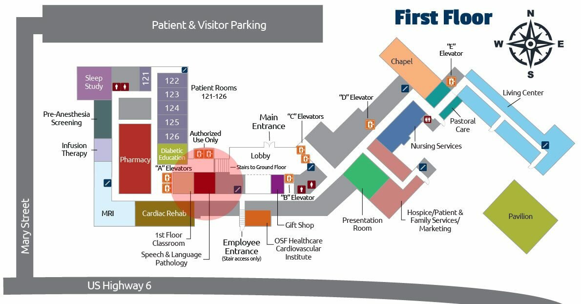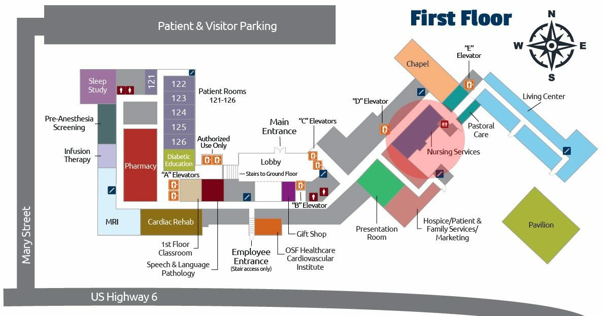 - The OSF Healthcare Cardiovascular Institute is to your left, across from the upper lobby area.