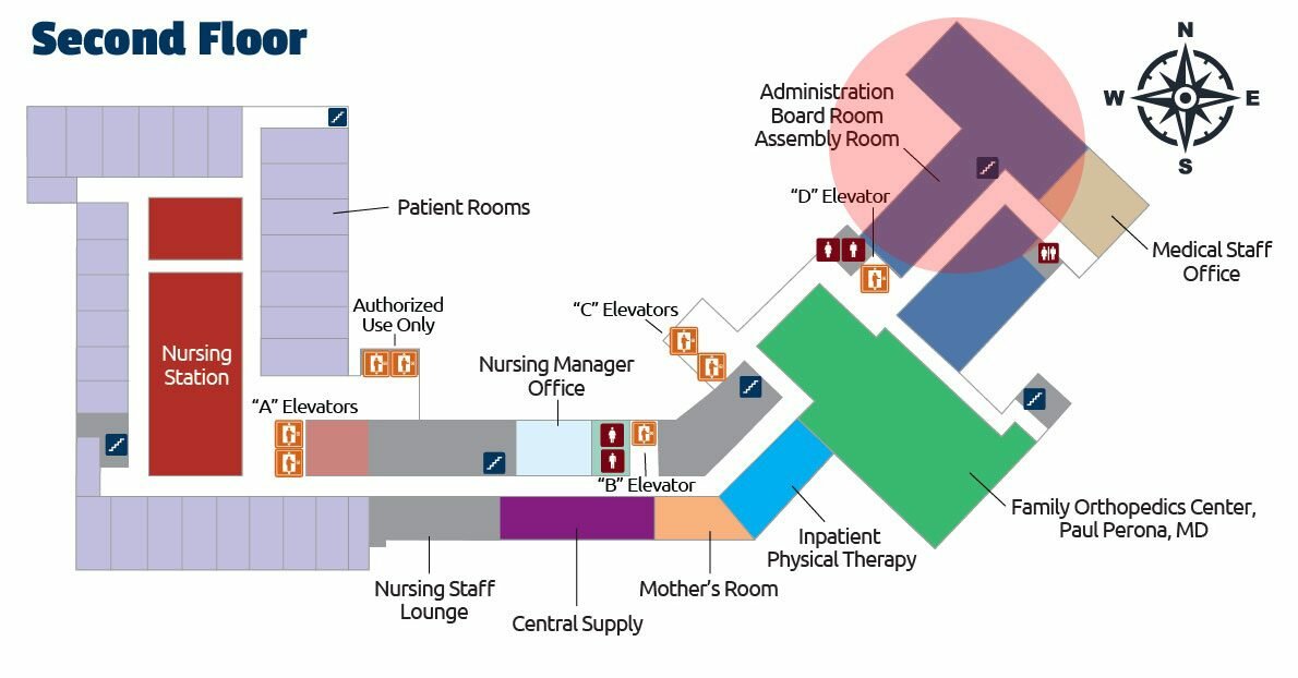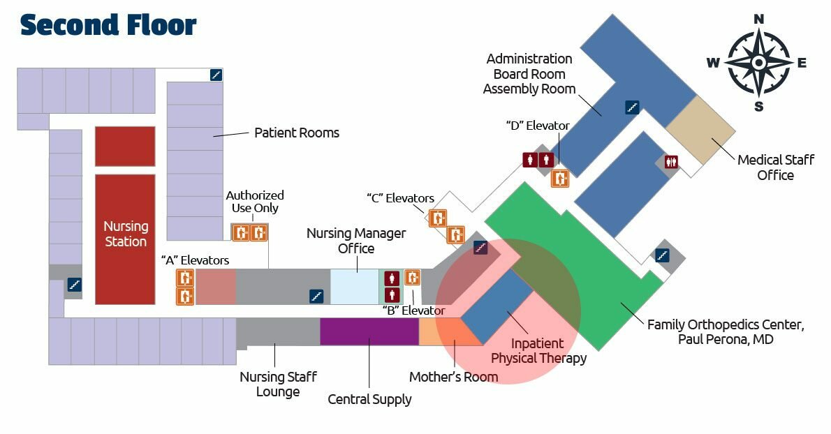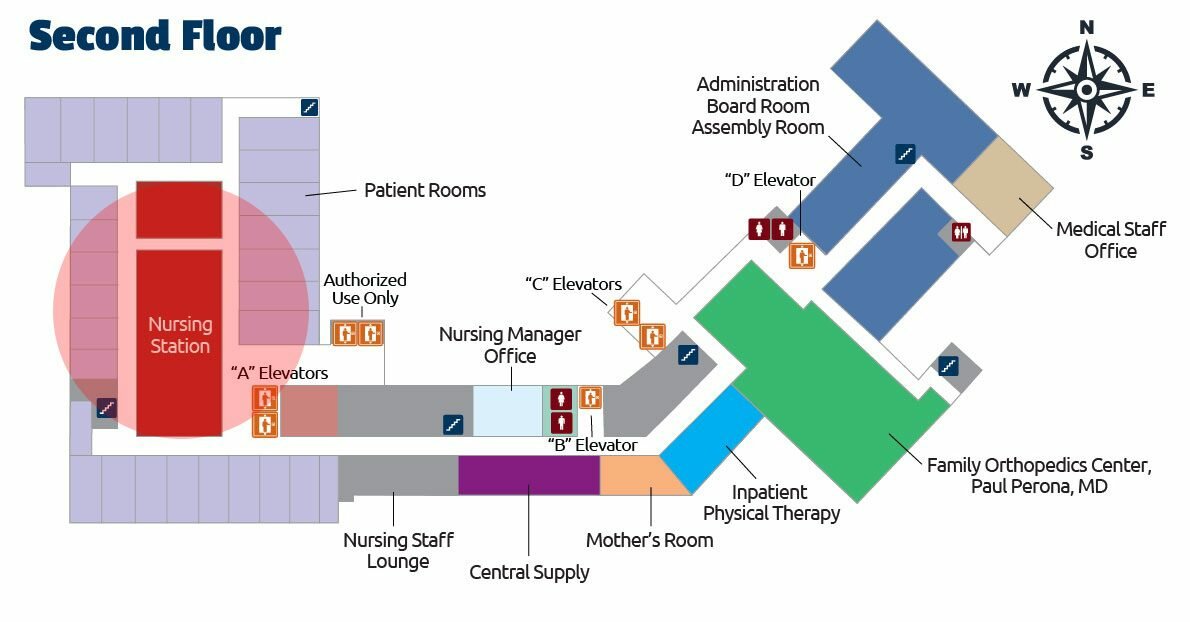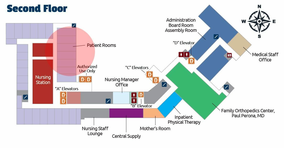 - Continue down the hall until you come to the Second Floor Patient Rooms.