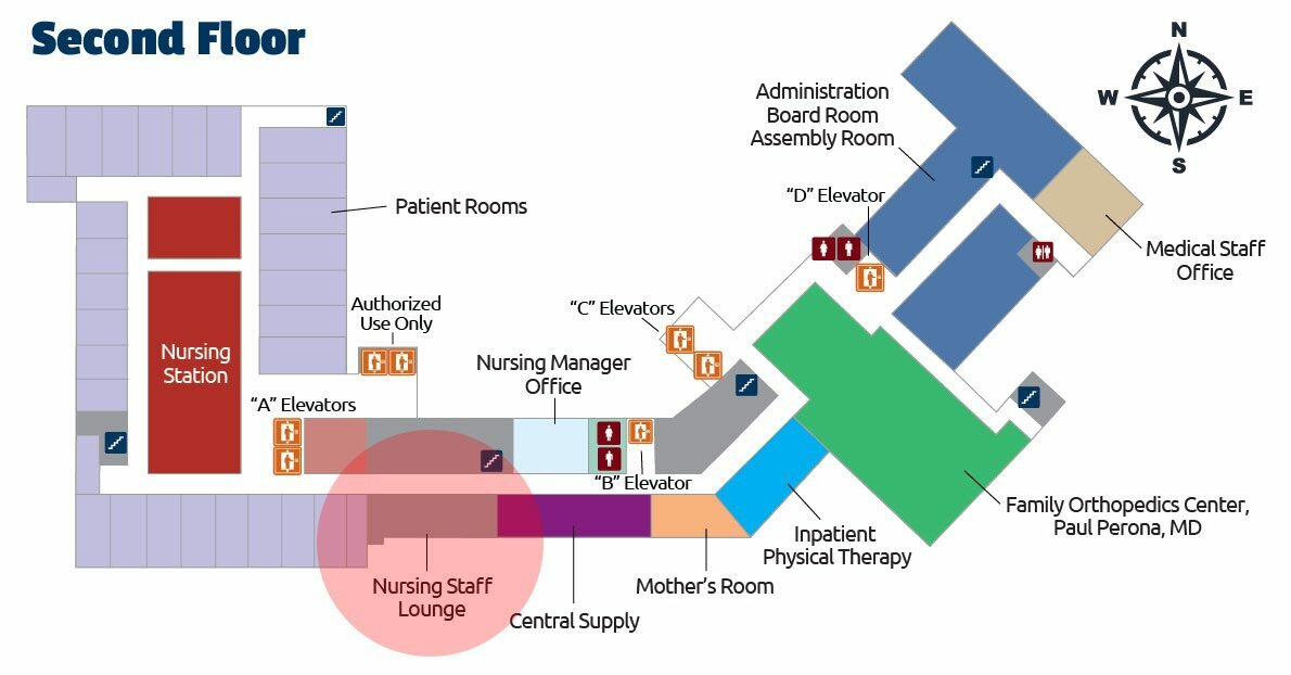 Located on the Second Floor of the St. Margaret’s Hospital, the Nursing Staff Lounge can be found in the West end of our building.